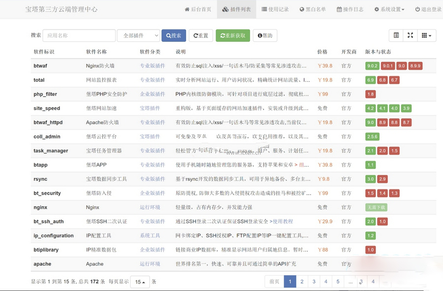 网站后台管理可一键同步宝塔官方的插件列表与增量更新插件包,还有云端使用记录、IP黑白名单、操作日志、定时任务等功能。