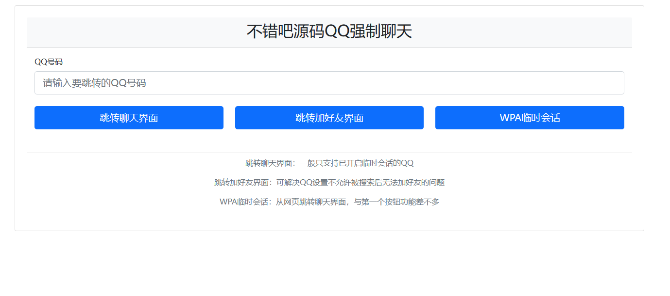 QQ强制聊天/加好友/临时会话接口跳转单页源码。实现以下功能:1.跳转QQ聊天界面:支持已开启临时会话的QQ用户进行聊天。2.跳转加好友界面:解决了QQ设置不允许被搜索后无法加好友的问题。3.WPA临时会话:可通过网页直接跳转至聊天界面,与第一个按钮实现相似的功能。接口全是官方的,上传到服务器就能用。