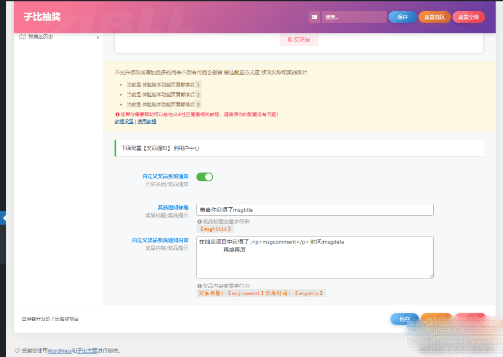 这个开源版的zibi子比转盘抽奖插件具备多种自定义功能。首先,你可以自定义奖品,根据你的需求和活动内容,设置不同的奖品名称、图片或其他相关信息。其次,你可以自定义奖品的几率。通过设置每个奖品的中奖几率,你可以控制抽奖的公平性和概率分布,以满足你的抽奖需求。最后,这个插件还支持自定义通知。当用户中奖时,你可以通过设置通知方式,如弹窗、邮件或其他方式,及时通知中奖用户,提升用户体验和互动效果。