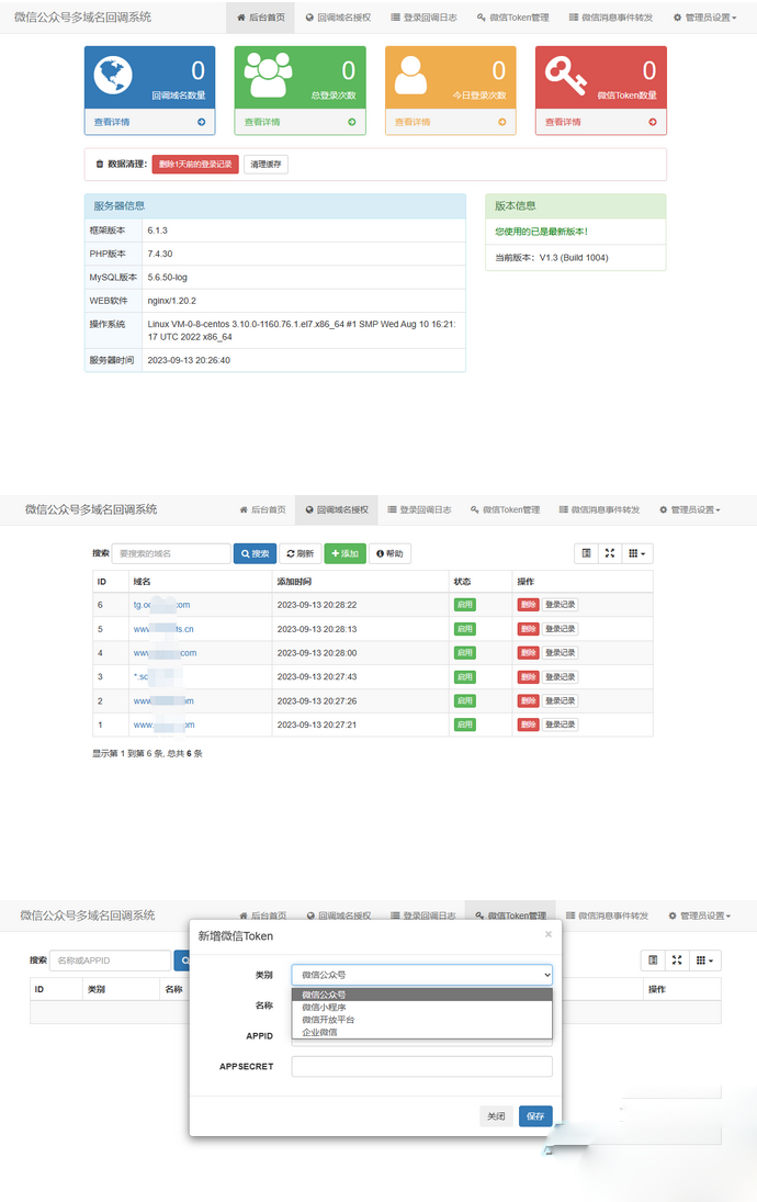 微信公众号多域名回调功能:微信公众号后台默认只能授权2个网页域名,用本系统突破这个限制,用同一个公众号对接无限多个网站。网站后台支持回调域名白名单的管理,以及登录记录的查看。