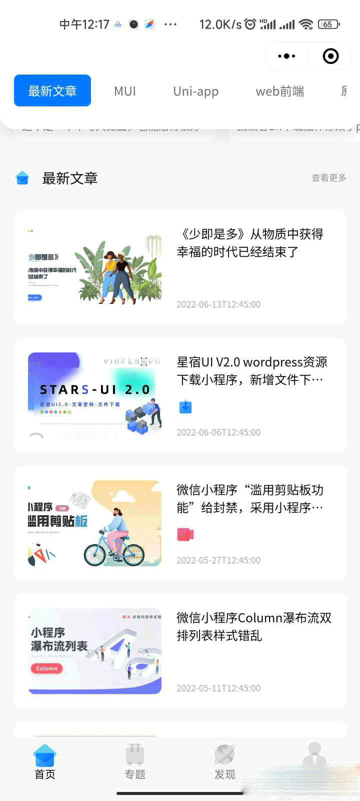 第一个小程序为星宿小程序目前是最新版2.0搭建星宿需要:备用域名 服务器 微信小程序账号功能:文章展示 文章分类 资源链接下载 轮播图直接下载附件功能 很多 很适合做资源类分享