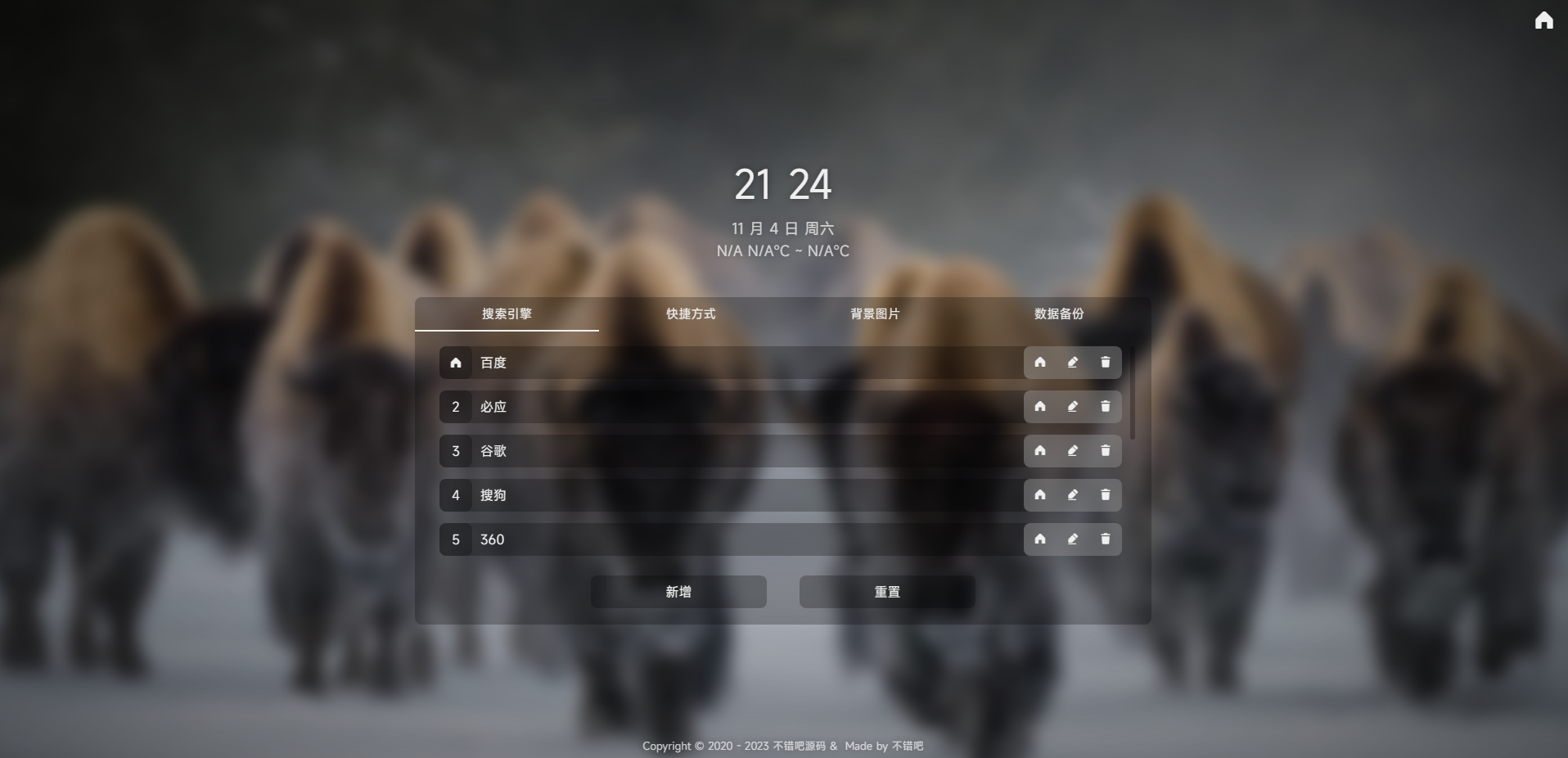 我花了8元购买的一个导航页源码,终于让我找到了类似的代码。这款导航页源码非常适合个人使用,它简洁漂亮,可以添加自己常用的网站,并支持其他用户自助添加快捷书签。此外,还能够自由添加多种快捷搜索方式,并且每天都有自动更新高清壁纸的功能。