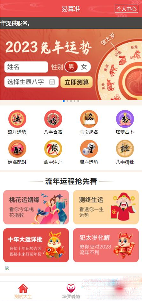 八字精批、事业财运、姓名分析、宝宝起名、公司测名、姓名配对、综合详批、姻缘测算、牛年感情、PC版测算、八字合婚、紫微斗数、鼠年运程、月老姻缘、许愿祈福、号码解析、塔罗运势、脱单占卜、感情继续、脱单占卜、塔罗爱情、心理有你、能否复合、暗恋对象、是否分手、爱着别人、大师服务(包含多项功能)共计30余项功能,全网功能全,完善的版本。