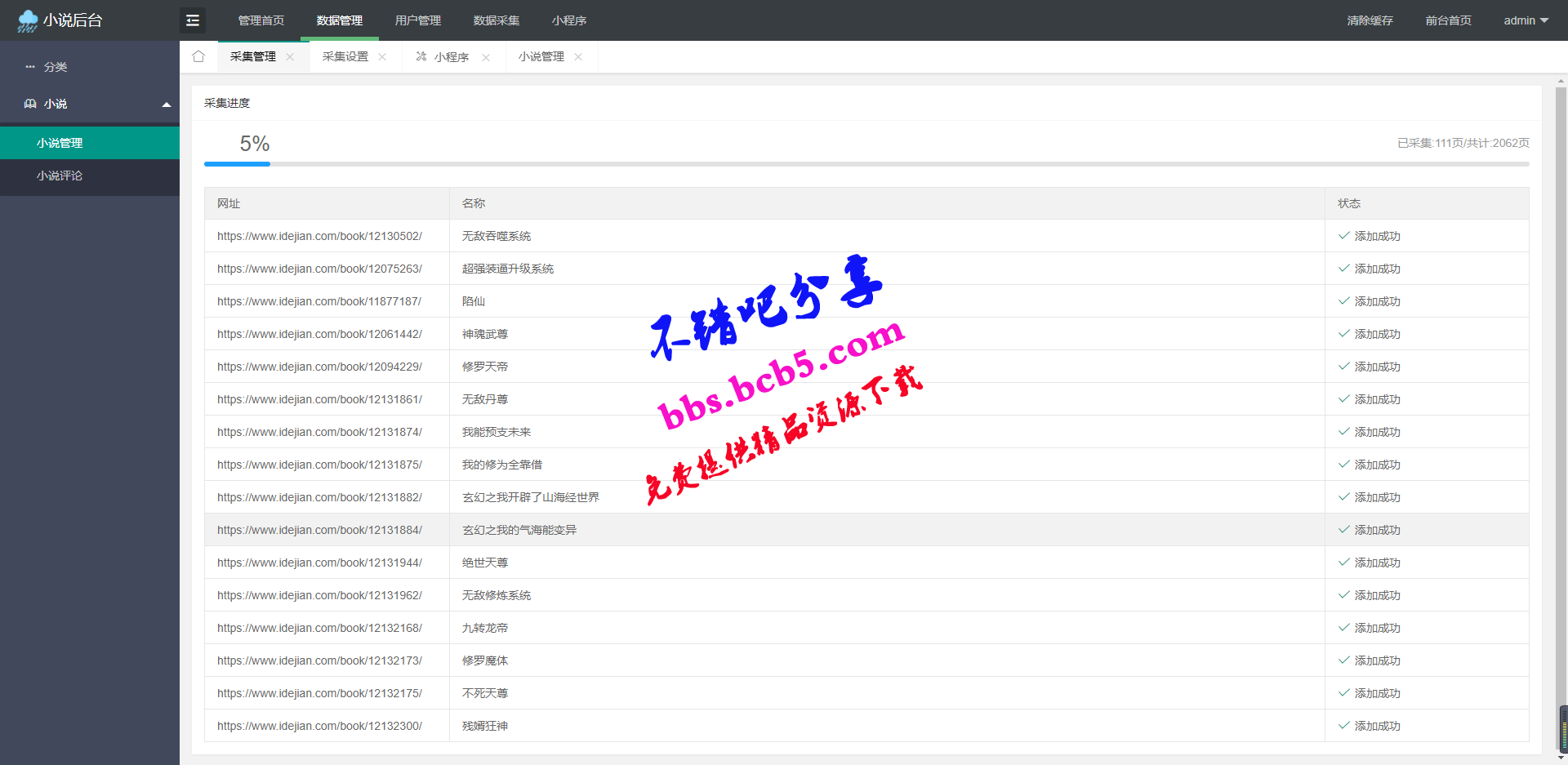 本套源码自带采集,拿到手的时候没有安装教程不过小编在测试的时候给大家把安装教程给补上了安装教程:PHP选择5.6以上的版本上传我们的后端解压伪静态选择thinkphp修改数据库链接文件config/database.php然后我们导入数据库后台访问地址域名/admin账号admin密码123456然后后台点击小程序把你的小程序该设置的设置就可以了小说的话就点击数据采集然后采集就可以了小程序首页轮播推荐和首页分类显示点击数据管理然后点击小说管理把你想推荐的小说推荐就可以了前端安装用微信开发者工具打开前端文件然后搜索ymcs.qqjas.com然后替换成你的域名即可合法域名设置自己的域名和两个小说源的域名,至于小说源的域名在压缩包里面的安装教程里面大家安装的时候复制填写即可下面是小编测试演示图:
