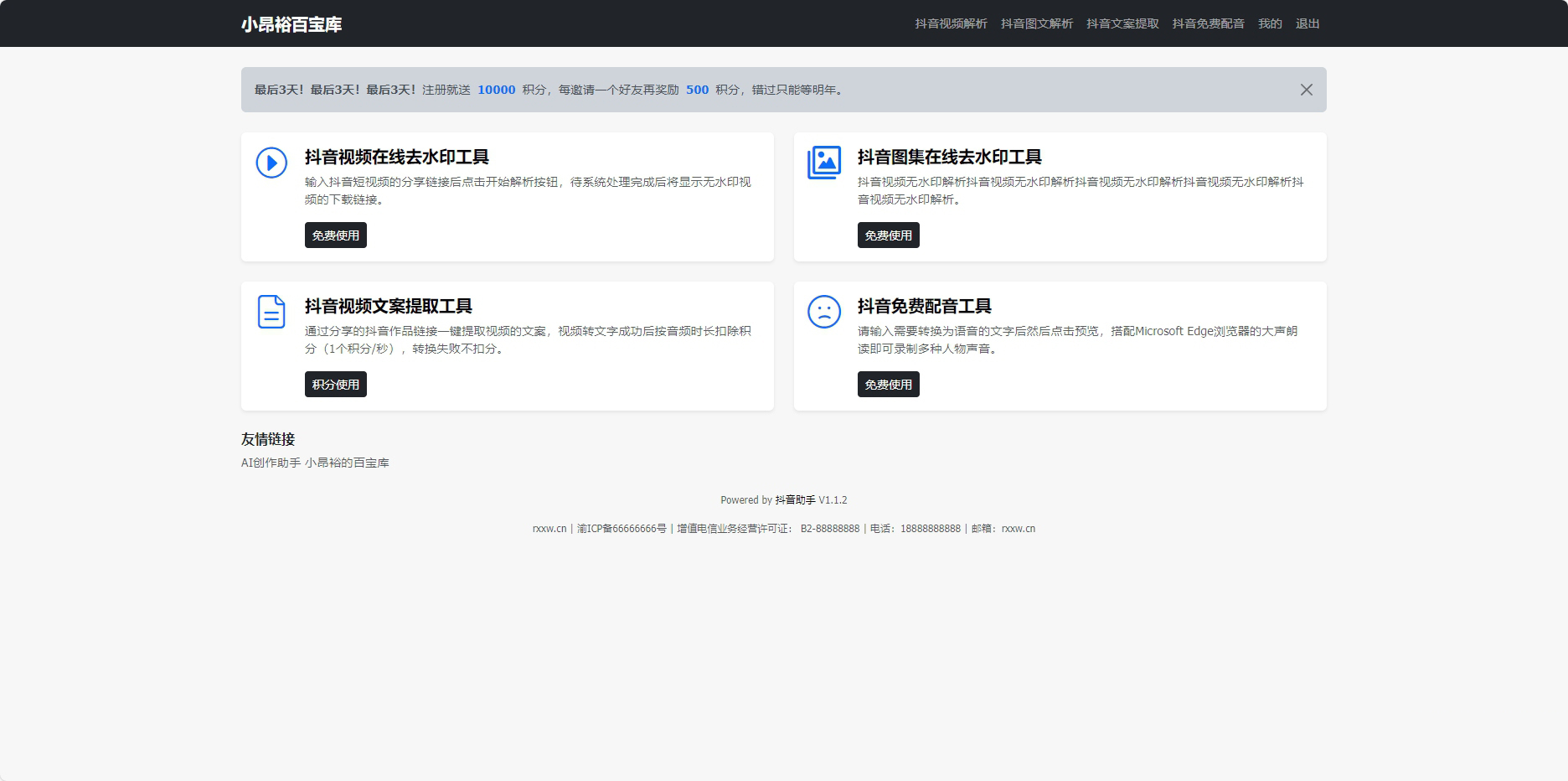 该在线服务平台采用高性能、易扩展的ThinkPHP框架作为核心技术支撑,整合了视频处理、数据分析、文案提取和配音等多种功能模块。